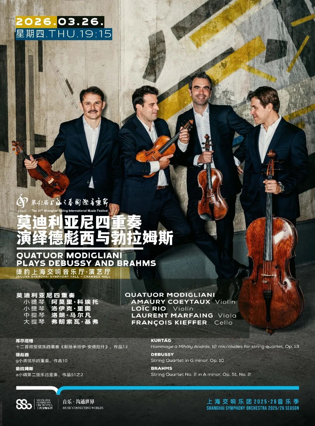 内容简介:莫迪利亚尼四重奏是当今最杰出的法国弦乐四重奏之一,同时担任“Vibre!”室内音乐节与波尔多国际弦乐四重奏大赛的艺术总监。演奏四把意大利名琴的他们,拥有格外优美圆融、层次分明且具辨识度的音色;其演奏更以高度精准与深思熟虑,让这份音色之美得以充分发挥。2026年是匈牙利作曲家库尔塔格的百年诞辰,四重奏将演绎他的《献给米哈伊·安德拉什》这一充满灵感与机巧的玲珑之作。德彪西的《g小调弦乐四重奏》堪称所有法国四重奏团体的试金石,而莫迪利亚尼的诠释注定与众不同。压轴之作勃拉姆斯《a小调第二弦乐四重奏》是作曲家立志比肩贝多芬与舒伯特的雄心之作,在规整的结构之下,蕴藏着典型的勃拉姆斯式繁复和声与绵密织体。