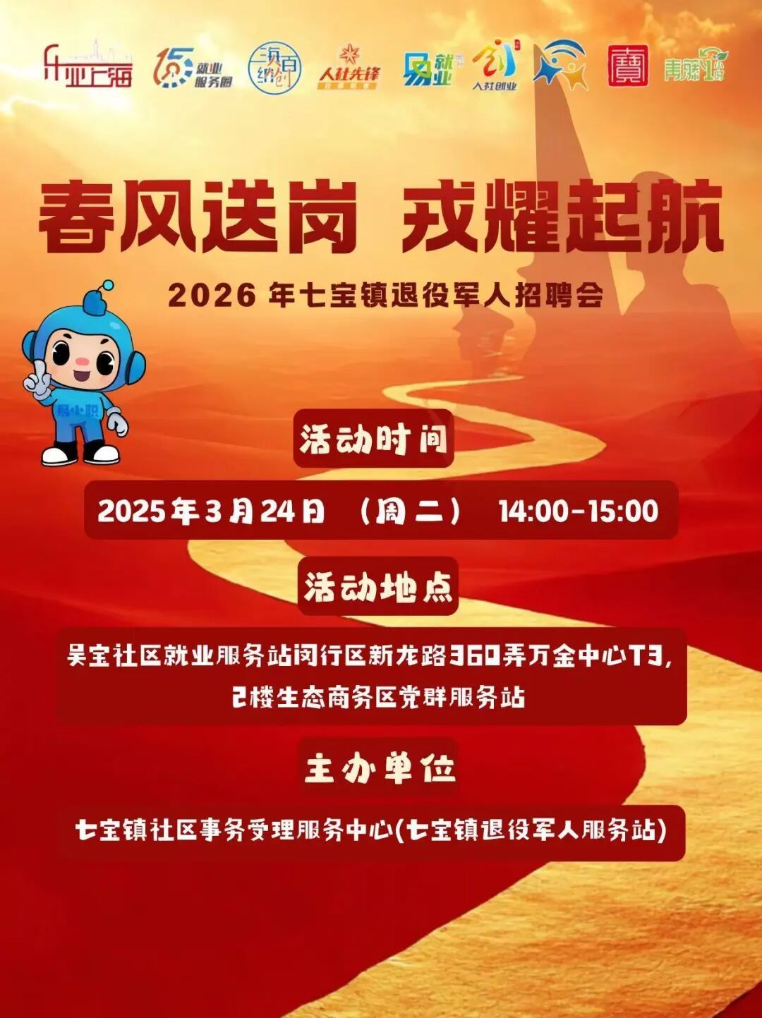 为切实做好退役军人就业创业工作,积极拓宽退役军人就业途径,搭建就业创业平台,2026年3月24日七宝镇在生态商务区(新龙路360号万金中心T3二楼)举办“春风送岗 戎耀起航”退役军人就业招聘活动。本次招聘会将汇聚众多优质企业,提供涵盖多个行业领域的丰富就业岗位。会场还有七宝镇专职武装干部现场解答参军应征政策和退役优待政策,有志投身国防的18至24周岁(不含)青年或家长不可错过。