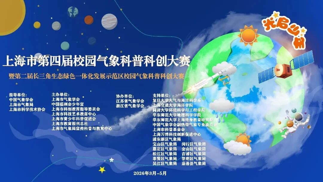 自主命名,播报内容可围绕气象科普、气象科创、天气播报、生活气象知识、我与天气的故事等内容开展;也可围绕2026年世界气象日主题“测今日气象,护明日家园”开展;也可结合与气象相关的古诗词、二十四节气等中国传统文化来开展,鼓励用AI场景、AI数字人进行辅助演播;也欢迎在播报的同时,借助实验器材、道具等开展与之相关的科学实验。鼓励学校或集团校统一组织,设计完整的二十四节气主题播报内容。对于完整展示二十四节气的作品,将在单项作品和优秀组织单位评选中给予加分,特别优秀尤其是结合探究成果的二十四节气完整作品还将有机会被推荐至上海技交所挂牌推广。