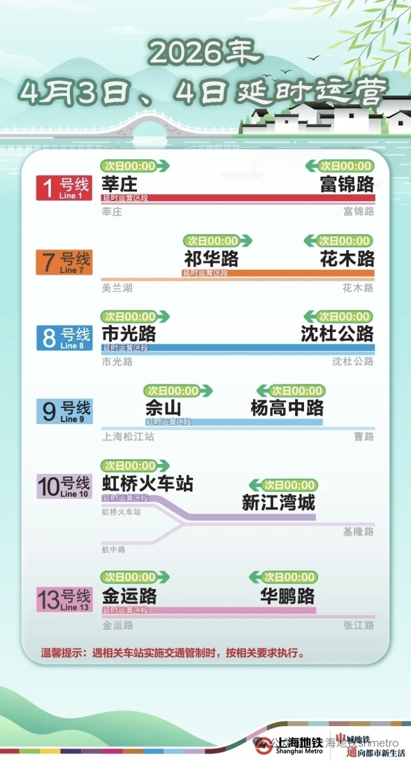 4月3日至4月4日,上海地铁1、7、8、9、10、13号线六线延时运营。为做好节假日返程期间枢纽站客流疏散工作,4月6日1、2、10、17号线实施定点加开方案,加开末班车发车时间延长至0点。