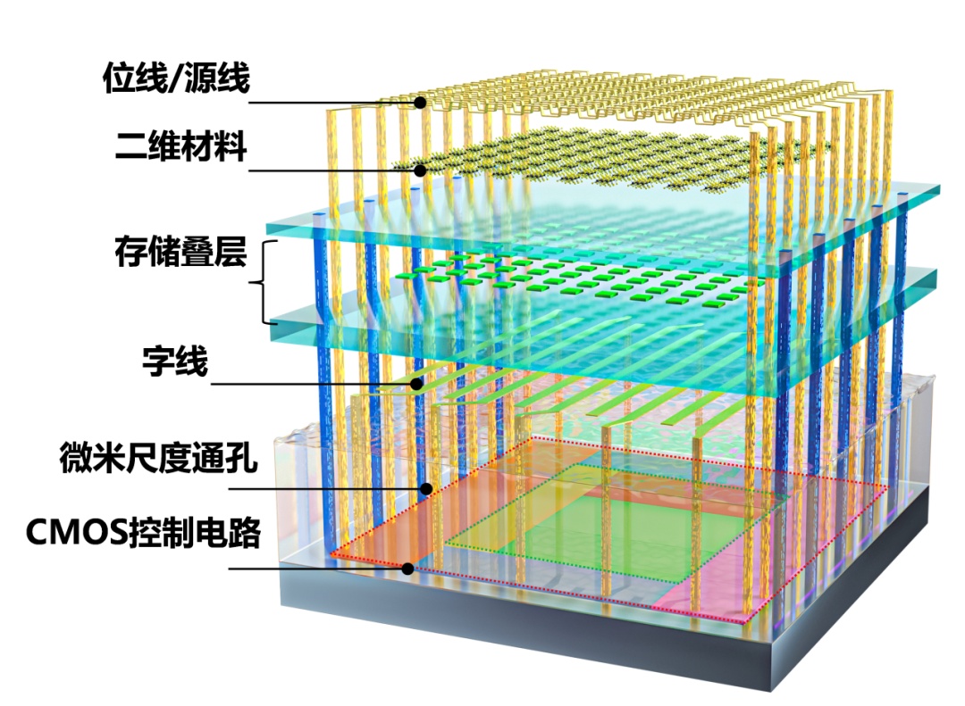 二维-硅基混合架构闪存芯片结构示意图,包含二维模块、CMOS控制电路和微米尺度通孔