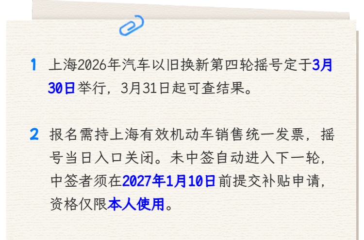 市商务委介绍,现定于2026年3月30日(周一)进行我市2026年度汽车以旧换新活动第四轮摇号,欢迎广大消费者积极参与报名。