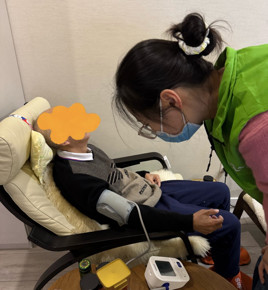 床边诊疗,细致入微。每到一户,家医团队成员都会为老人进行身体检查,包括检查BMI、测量血压、血糖,心肺听诊等。针对患有高血压、糖尿病、冠心病等慢性病的老人,他们详细询问近期身体状况和用药情况,并根据检测结果现场调整用药方案,还手把手指导家属及老人正确使用吸入剂、胰岛素笔等医疗器械。