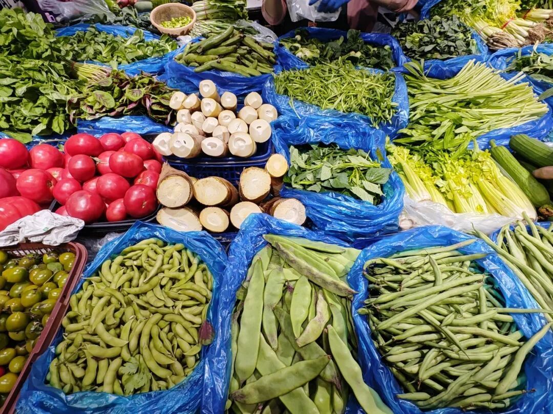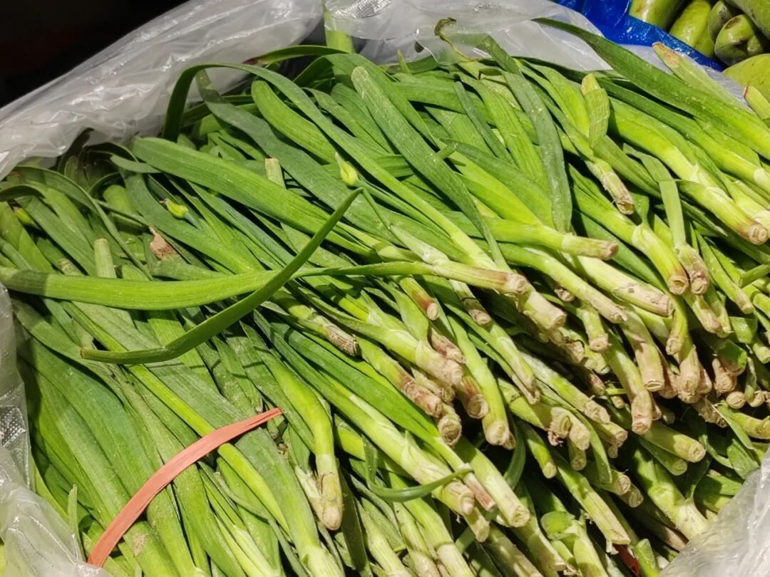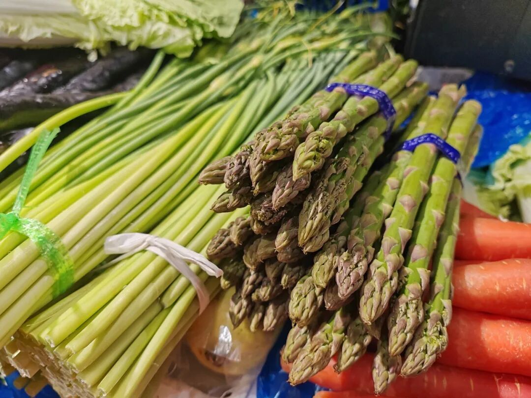步入菜市场,蔬菜摊位上绿意盎然,红头韭菜、芦笋、蓬蒿、空心菜等鲜嫩蔬菜整齐码放,翠绿的色泽透着新鲜,吸引不少市民驻足挑选。