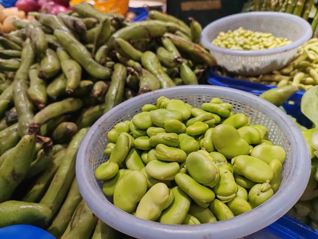上市已有一月有余的蚕豆,依旧是菜场里的“人气选手”。摊主表示,刚上市的蚕豆以鲜嫩见长,如今的蚕豆口感愈发粉糯,无论是做成咸菜豆瓣、葱油蚕豆,还是搭配食材烧汤,都鲜香味美,是春日餐桌的经典菜品。