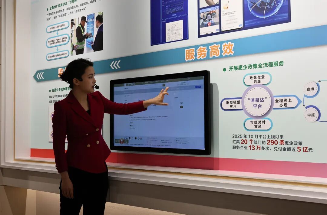 图为讲解员在触控屏幕前为参观者介绍上海一网通办“浦易达”平台的功能(新华社记者 方喆 摄)