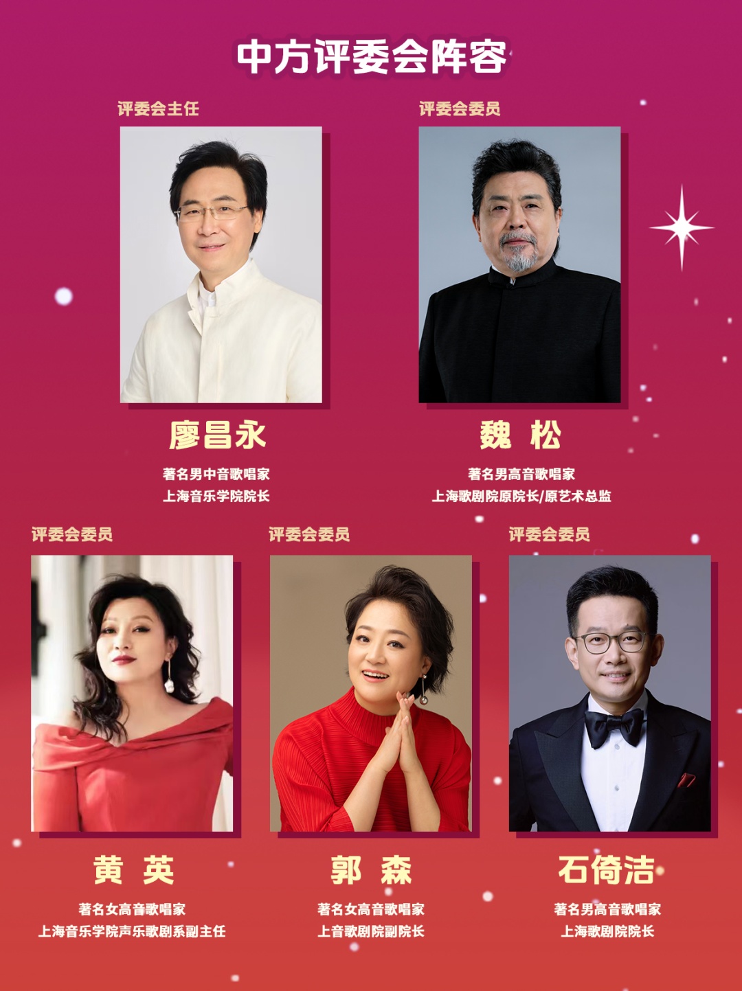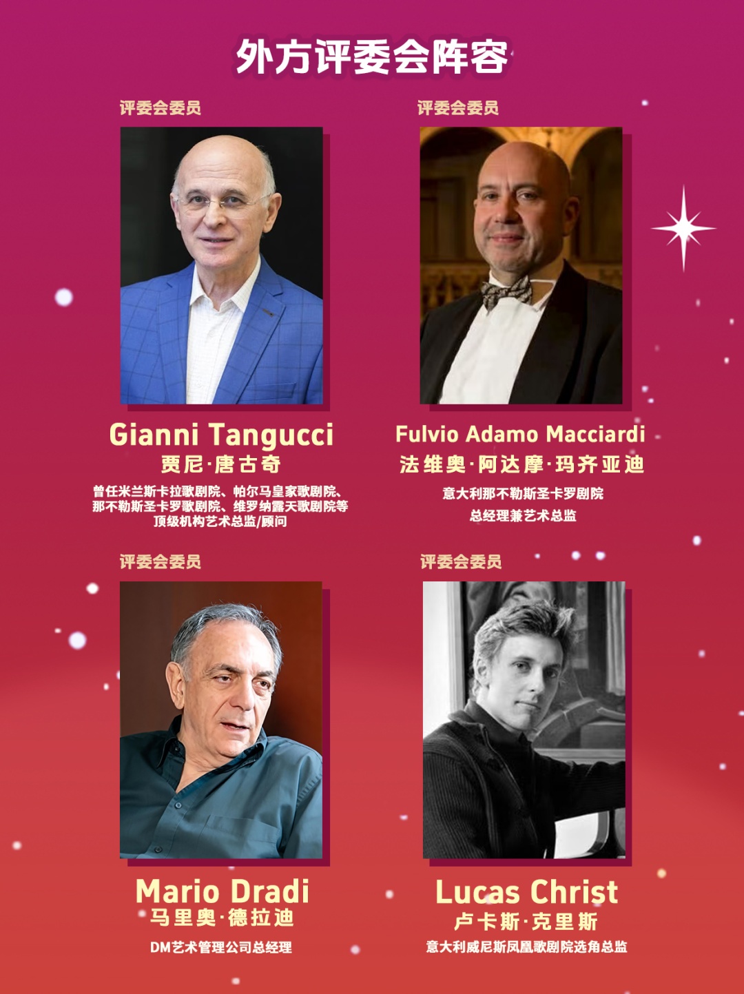 决选音乐会现场,廖昌永、魏松、黄英、郭森、石倚洁等享誉国际的著名中国歌唱家,与贾尼•唐古奇、法维奥•阿达摩•玛齐亚迪、马里奥•德拉迪、卢卡斯•克里斯等国际顶尖歌剧院、艺术管理公司的艺术总监、总经理及选角总监,将组成超强国际评委阵容齐聚上海音乐厅,以他们深厚的艺术积累、丰富的舞台经验、敏锐的职业眼光,为中国歌剧、乃至世界歌剧的舞台甄选潜力无限的优质“千里马”。