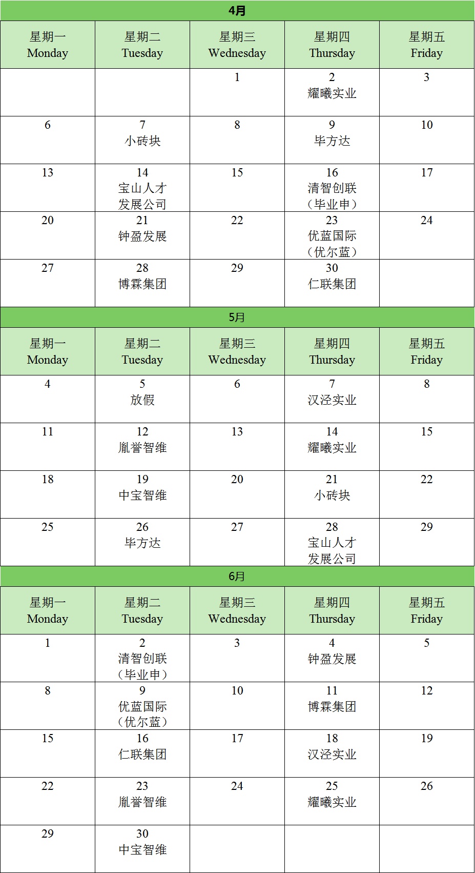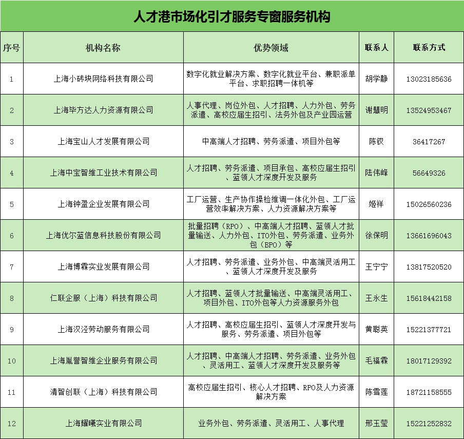为了积极营造“才涌三江,聚宝成山”的人才发展生态,12家区内优质人力资源服务联盟单位进驻宝山科创人才港“市场化引才服务专窗”,定期提供专窗服务。企业可依托该专窗与区内优质人力资源服务机构进行面对面、一对一的咨询洽谈,无论是制定个性化的引才策略,还是拓展多元化的引才渠道,亦或是解决引才中的难题,“市场化引才服务专窗”都能给予有力支持。 服务机构名单 2026年第二季度服务轮值表 服务时间:每周二、周四(法定节假日除外) 服务地点:宝山科创人才港(同济路666号) 咨询电话:56100104 各位企业HR,宝山区科创人才港 “市场化引才服务专窗” 期待您的光临! 如有入驻宝山区科创人才港“市场化引才服务专窗”意向的人力资源(机构)企业,可拨打咨询电话,欢迎您的加入!