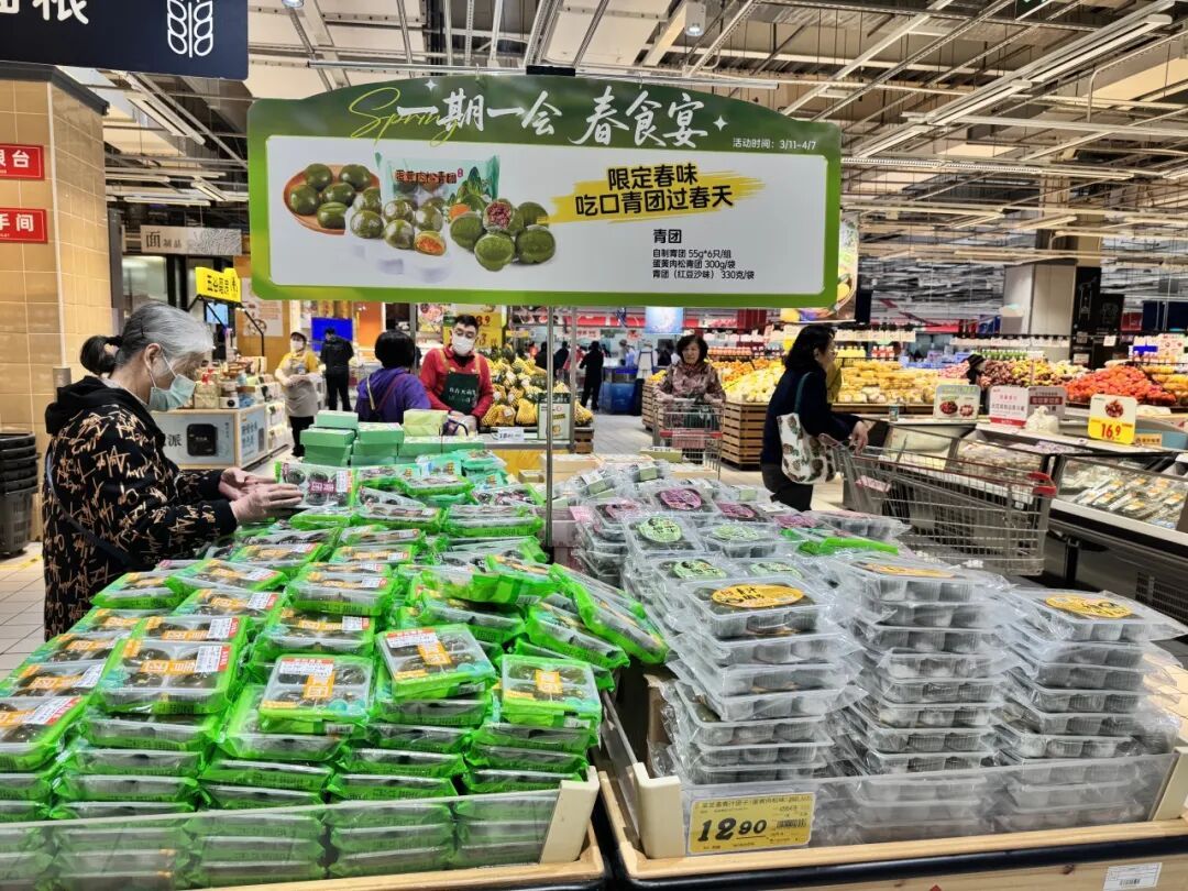 清明将至,申城各大商超卖场迎来“青团大战”,传统与创新同台竞技,吸引不同年龄层消费者争相购买。