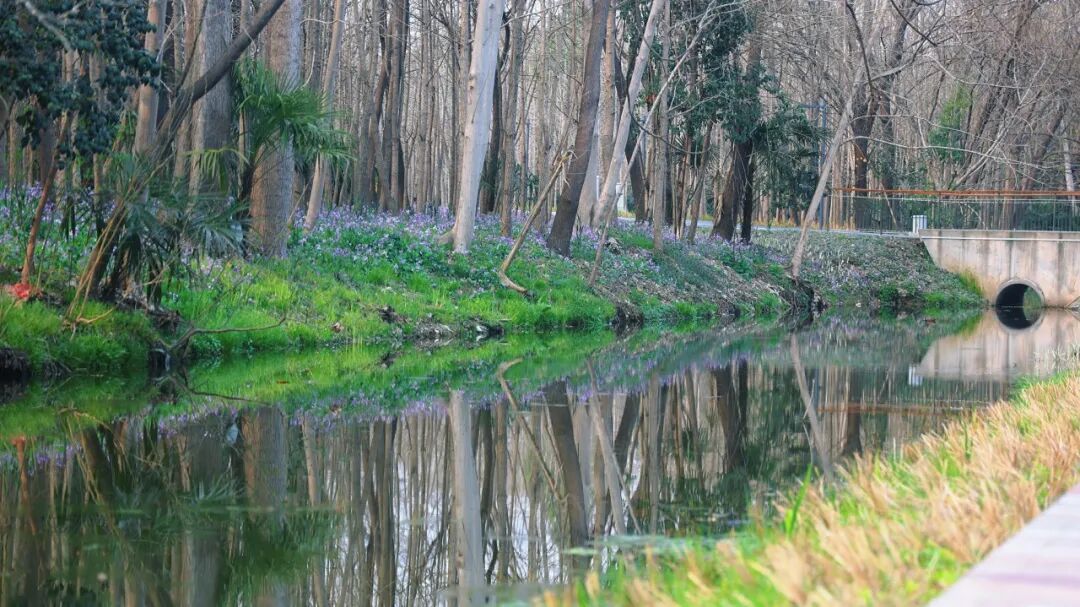 春日的申纪港公园,二月兰正盛,雪柳如云,水清岸美。