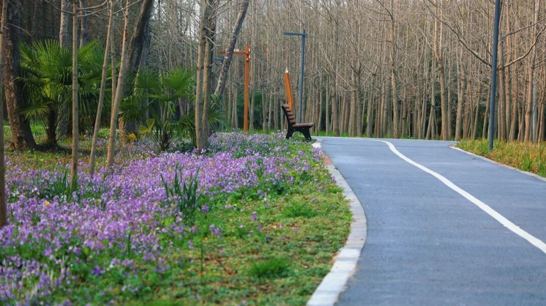 一丛丛、一簇簇,淡紫色的小花密密匝匝地铺陈开来,从林下一直蔓延到步道边缘。阳光透过水杉尚未繁茂的枝桠,斑驳地洒在花瓣上,光影流转间,整片林子都笼上了一层梦幻的滤镜。