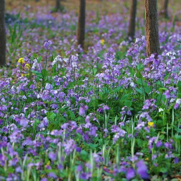 而就在这片挺拔的森林之下,二月兰正开得热烈。