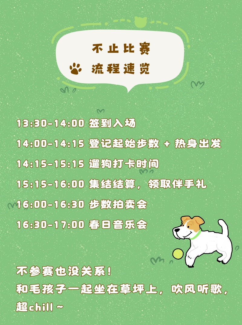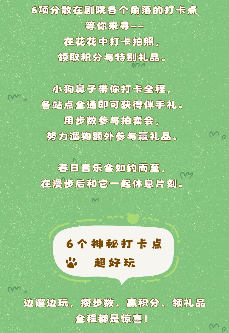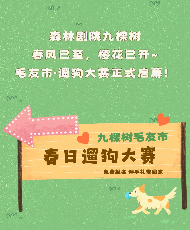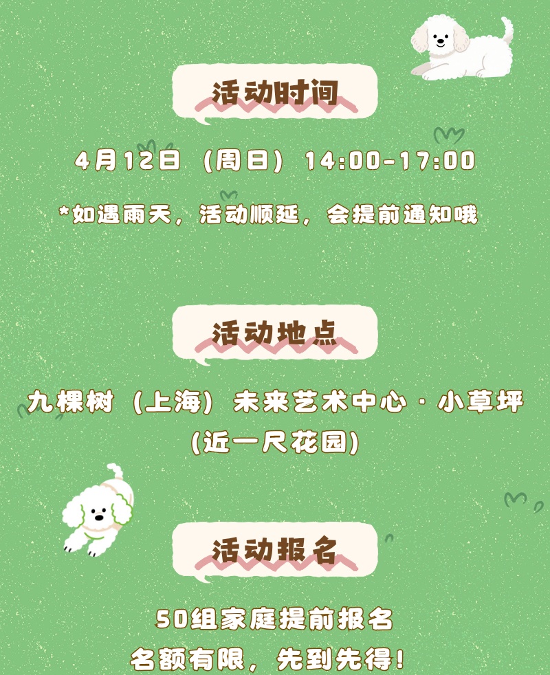 一、爱宠入场温馨提示 1.本次活动暂不接待未免疫未办证犬只及城市禁养犬只,可参考《关于本市禁止个人饲养的烈性犬只目录的通告》([沪公发(2011)99号)]。 2.进入剧院场地,爱宠需至少有1位成年人全程牵绳陪同,大型犬只请戴好嘴套(肩高35cm及以上),牵引绳不得超过两米。 3.为避免爱宠丢失情况,爱宠尽量佩戴标有紧急联系方式的铭牌。 4.为保证爱宠全程舒适,家长可携带宠物毯子、宠物尿垫、便携喝水杯、餐巾纸、湿纸巾、拾便袋等。 5.为保证爱宠游玩体验,九棵树萌宠公园设施仅限宠物游玩,请照看好身边的儿童。 二、免责及重要说明 1.九棵树萌宠系列活动所有场次为宠物友好,是爱宠人士的共同努力,才能实现萌宠进入剧院,因此,请保证爱宠的情绪稳定,以免伤到其它爱宠及家长。 2.本此活动为免费公益活动,宠物之间、人宠之间发生任何冲突及伤害,主办方不承担任何责任,入场即视为同意。