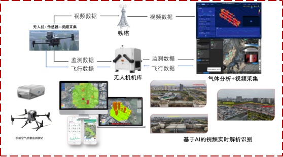 (2)搭建“塔机视联”系统,实现铁塔高空瞭望与无人机联动。通过无人机搭载摄像头及微型化传感器舱体,实现飞行路径下异常事件实时识别和颗粒物浓度的实时监测;通过铁塔视频监控与无人机飞控终端互联,实现“塔机视联”,基于铁塔自动预警事件一键触发无人机执飞,开展预警事件现场核查监测确认,并推送相关管理部门,实现了全天候、多维度扬尘污染监测监控。
