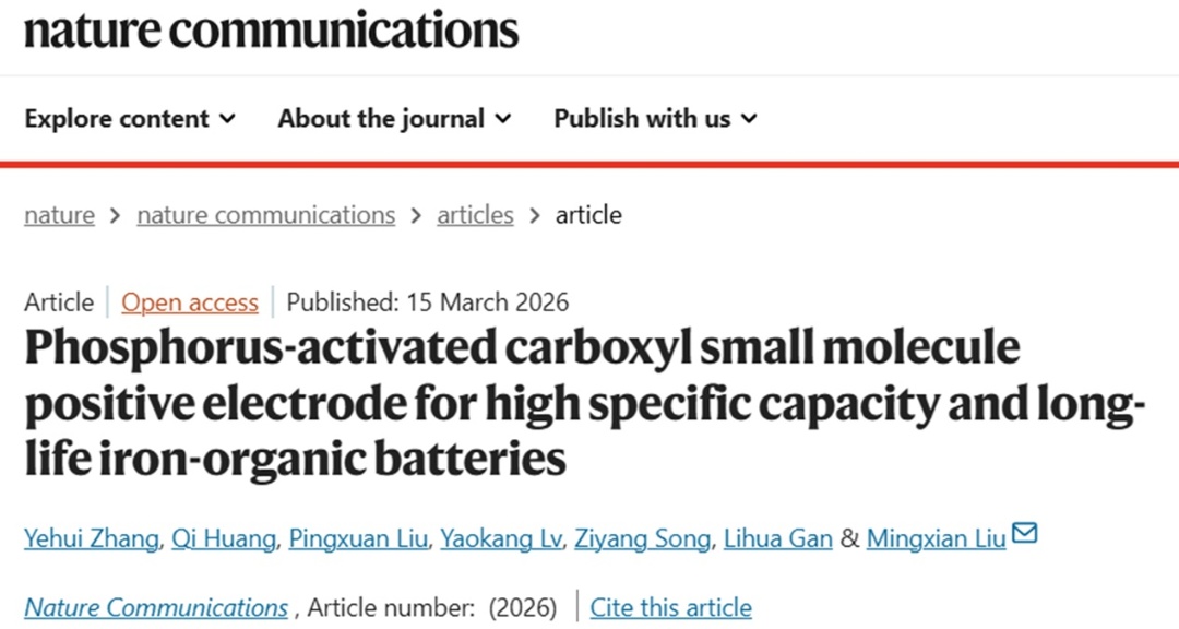 水系电池凭借本征安全、环境友好和成本优势,正成为下一代储能器件的重要研究方向。近日,化学科学与工程学院甘礼华、刘明贤团队研究成果发表于《自然·通讯》(Nature Communications)。该研究提出磷激活羧基小分子策略,通过精妙的分子工程设计,解锁了磷元素的氧化还原活性,实现了铁-有机电池性能的重大突破,有效解决了有机小分子正极活性位点利用率不足及稳定性较差的难题,构建了高比容量和长循环寿命的水系铁-有机电池。