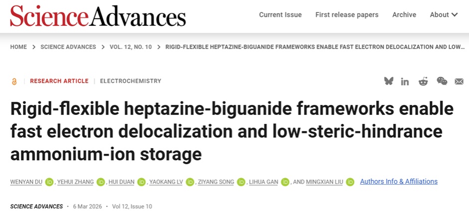 近日,团队又一研究成果发表于《科学进展》(Science Advances)。团队设计了刚柔并济的七嗪-双胍聚合物框架(HBFs)材料作为铵离子电池负极材料,既发挥了刚性七嗪单元快速电子离域的特点,又利用了柔性双胍嵌段降低活性基团空间位阻的优势,构建了兼顾高容量与高倍率的铵离子电池。