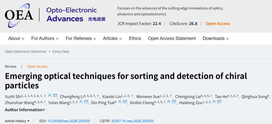 近日,团队与上海市眼病防治中心(同济附属眼科医院(筹))邹海东、王于蓝团队及合作者研究成果发表于《光电进展》(Opto-Electronic Advances),并入选封面文章。该研究系统梳理并总结了近年来光学手性分选与检测领域的重要研究进展,对光学手性分选与检测在实际应用场景下面临的关键挑战与未来发展趋势进行了展望。