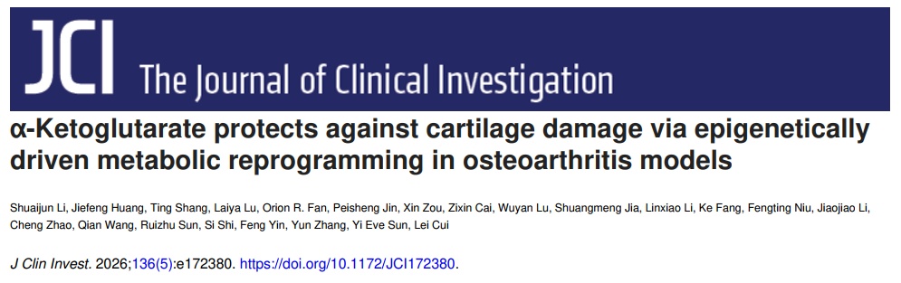 软骨细胞代谢紊乱是骨关节炎的关键驱动因素,但其背后的分子机制尚不清楚。近日,医学院崔磊团队研究成果发表于《临床研究杂志》(Journal of Clinical Investigation)。团队从临床样本切入,系统解析了骨关节炎患者及模型小鼠软骨的代谢特征。该研究首次揭示,谷氨酰胺代谢障碍是骨关节炎发生发展的关键驱动因素,并发现其下游代谢物α-酮戊二酸可通过表观遗传调控逆转软骨细胞的代谢失衡,为骨关节炎的治疗提供了全新靶点。