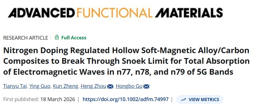 如何突破Snoek极限,实现对5G全频段电磁波的高效吸收,是智能电子设备在民用和专用领域面临的难题。近日,化学科学与工程学院谷红波团队与合作者研究成果发表于《先进功能材料》(Advanced Functional Materials),并被遴选为期刊内封面文章。该研究通过氮掺杂调控中空软磁合金/碳复合材料(CoNi@NC)的电磁参数,成功构建了磁-介电协同损耗体系,首次实现了对5G频段n77、n78和n79的全吸收,为5G通信设备、雷达隐身技术和智能电子器件的电磁防护设计提供了新的策略,为下一代多功能、轻量化电磁波吸收材料的发展带来了重要机遇。