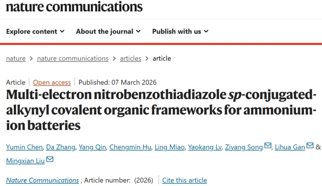 近日,团队另一研究成果发表于《自然·通讯》(Nature Communications)。团队设计了多电子硝基苯并噻二唑共价有机框架,有效解决了单电子储能容量低和结构不稳定的问题,构建了高能量密度和超长循环寿命的铵离子电池。