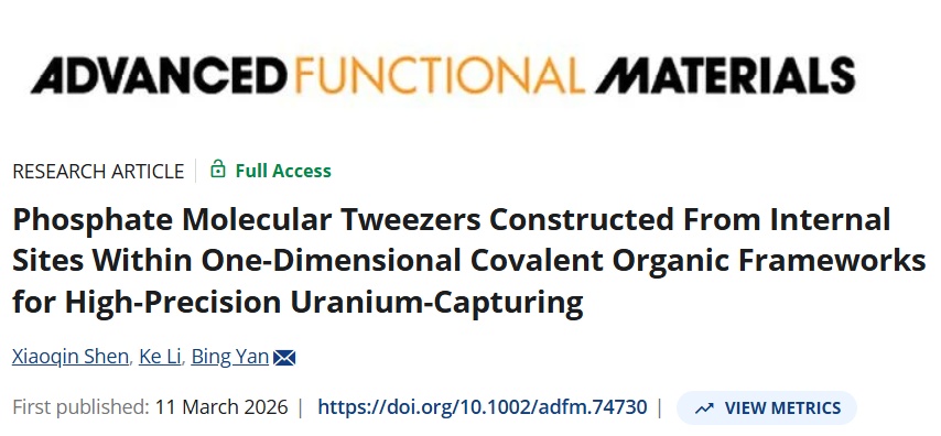 铀裂变能作为目前唯一能够实现大规模可控利用的核能形式,在核能产业链中占据着不可替代的地位。近日,化学科学与工程学院闫冰团队研究成果发表于《先进功能材料》(Advanced Functional Materials)。该研究通过对含羟基官能团的1D COFs进行磷酸化修饰,成功在COFs的孔道内构建了铀酰(UO22+)特异性纳米陷阱,实现了对其精准捕获。这种结合空间限域、协同配位与结构自适应的策略,为高效环境治理材料的设计提供了新的方向。