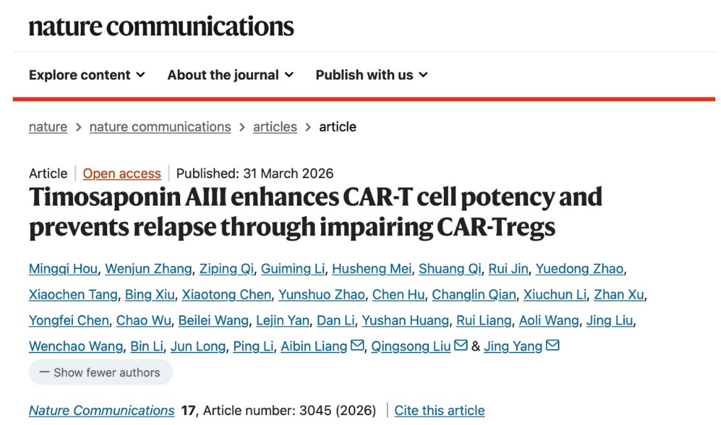 如何在不伤及效应细胞的前提下精准清除CAR-调节性T细胞(CAR-Tregs),是突破CAR-T疗法(嵌合抗原受体T细胞免疫疗法)瓶颈的核心难题。近日,生命科学与技术学院杨静、附属同济医院梁爱斌与合作者研究成果发表于《自然·通讯》(Nature Communications)。该研究首次发现源自中药知母的天然产物知母皂苷AIII能够精准清除CAR-Tregs、显著增强CAR-T疗法的抗肿瘤效果并防止复发,并完成了从靶点发现、机制解析到临床验证的完整闭环,有望成为CAR-T疗法中不可或缺的“黄金搭档”。