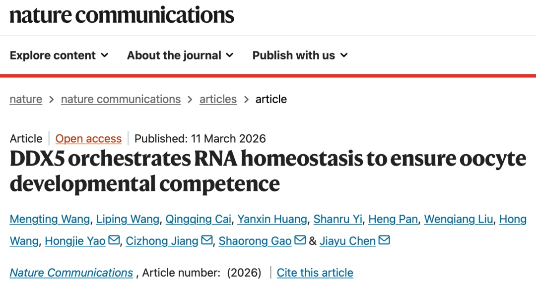RNA解旋酶DDX5是DEAD-box家族核心成员,它在哺乳动物雌性生殖中所扮演的角色有待阐明。近日,生命科学与技术学院高绍荣/陈嘉瑜/江赐忠团队与合作者研究成果发表于《自然·通讯》(Nature Communications)。该研究首次系统揭示了DDX5在卵母细胞发育过程中协调RNA稳态的分子机制,不仅从mRNA层面揭示了DDX5在转录及转录后调控中的功能,更从逆转座子RNA清除这一新视角切入,为理解卵母细胞发育机制提供了重要启示,确立了DDX5作为卵母细胞发育和雌性生殖关键调控因子的核心地位。