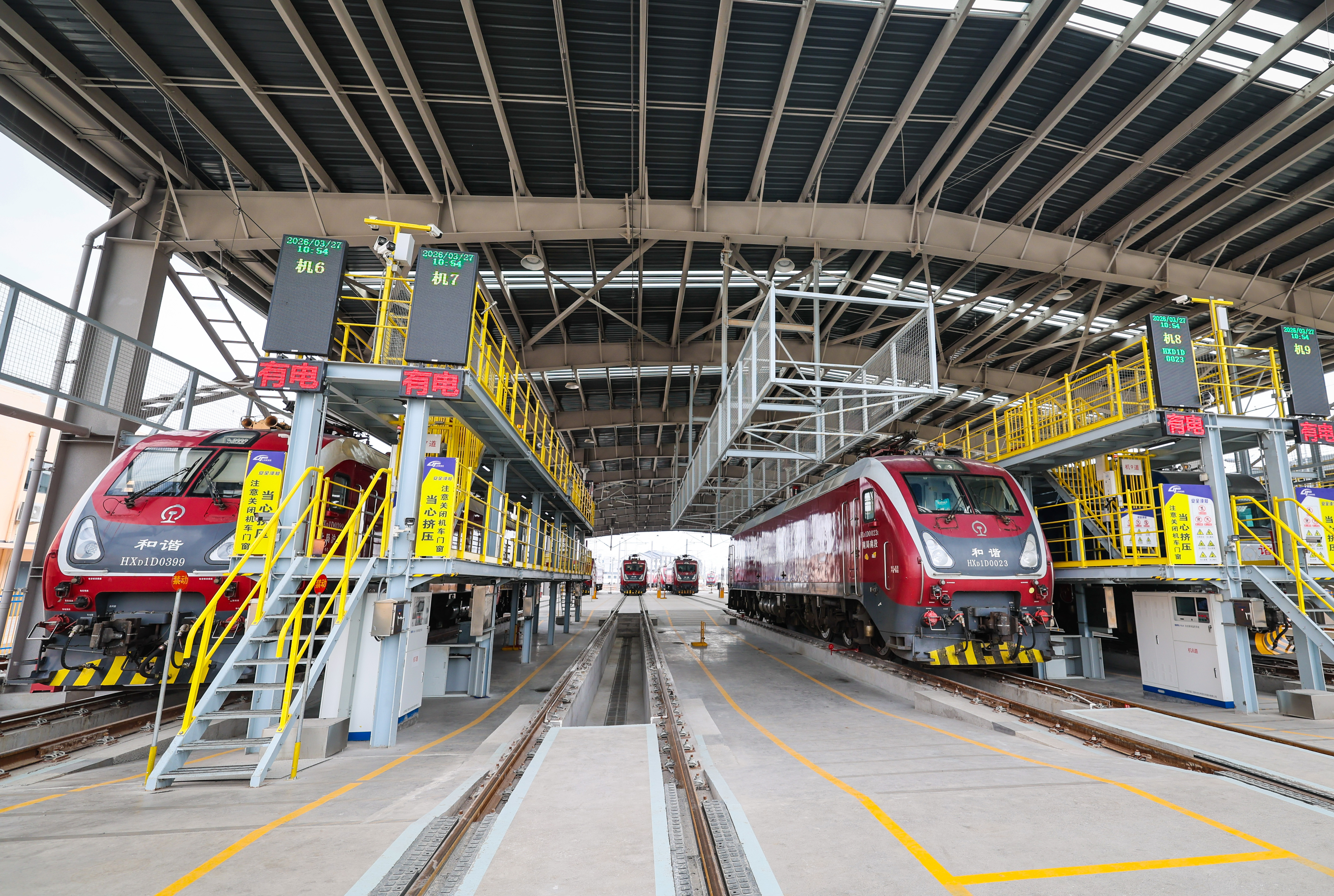 机车整齐列阵,静待出发。