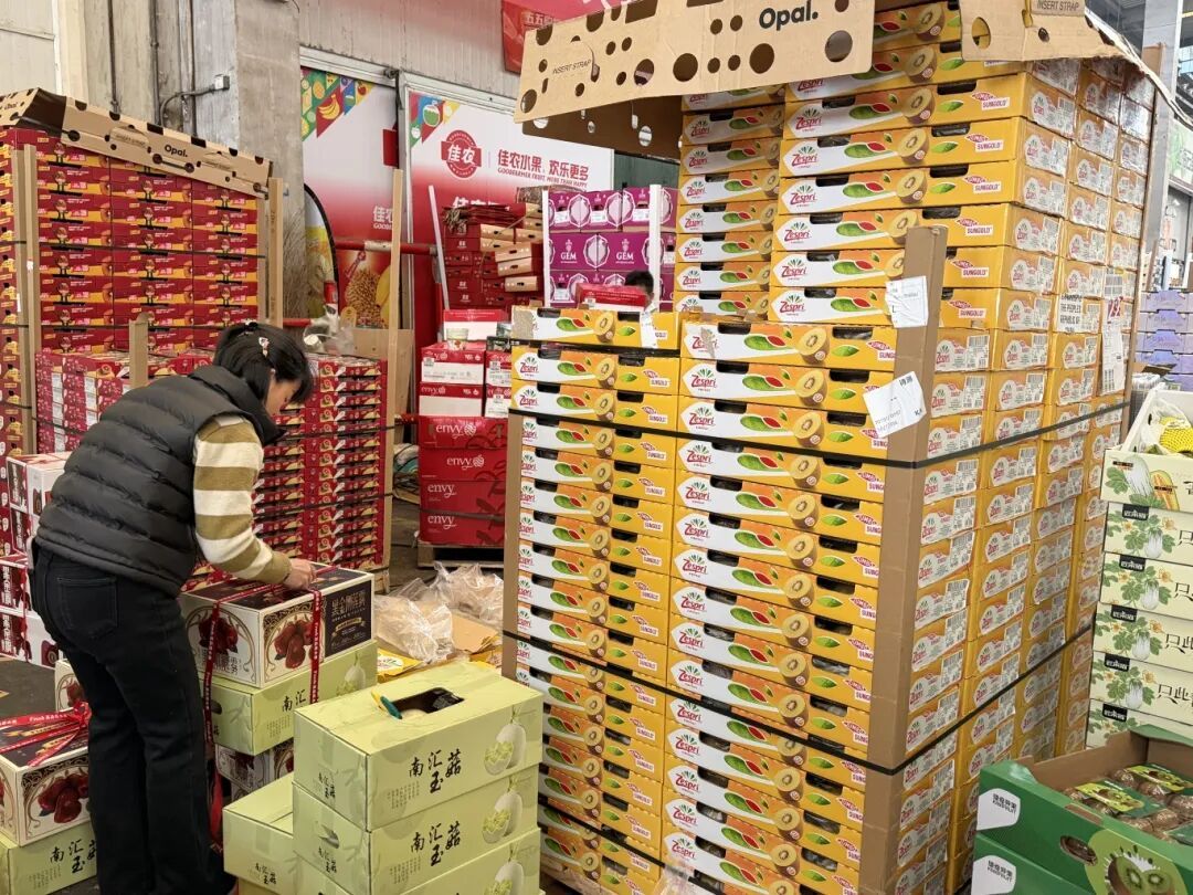 在上海西郊国际农产品交易中心的果品交易区,一箱箱印有“Zespri”标识的奇异果整齐码放,工作人员忙着将成箱的奇异果搬上手推车,发往各大销售终端。