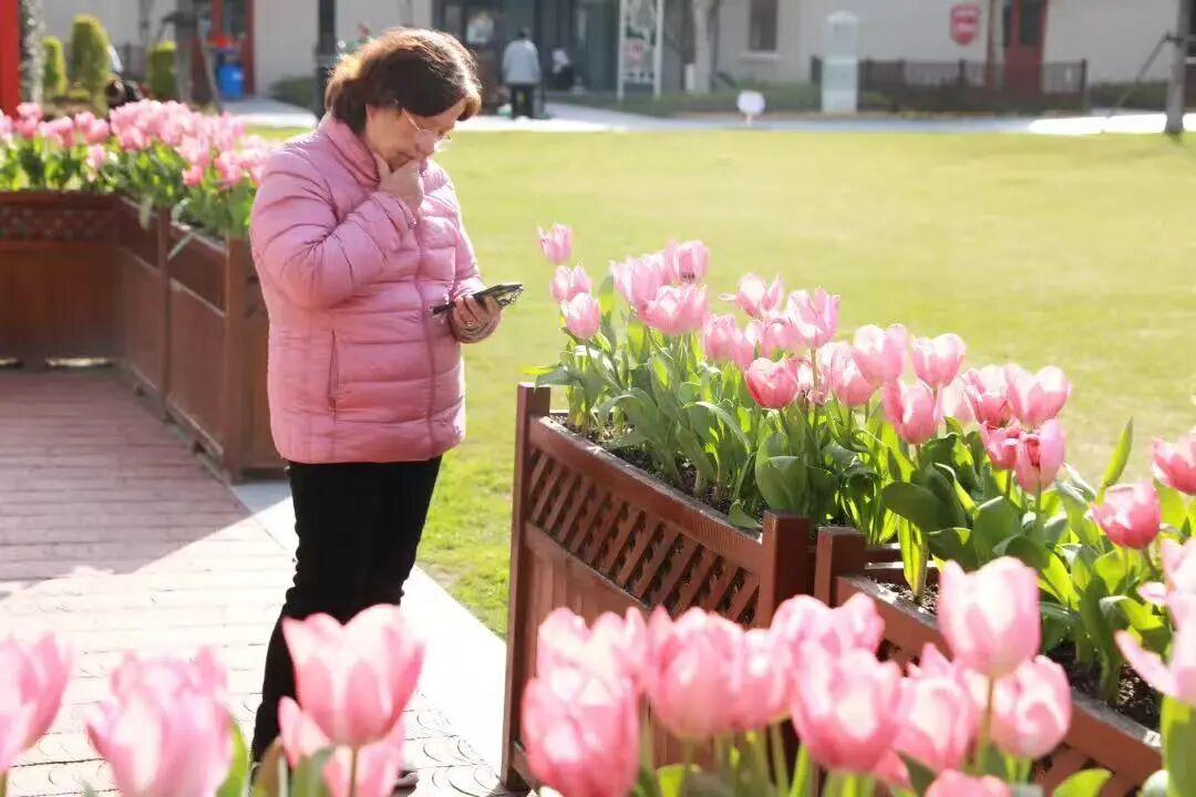 一位阿姨在花丛旁低头看着手机
