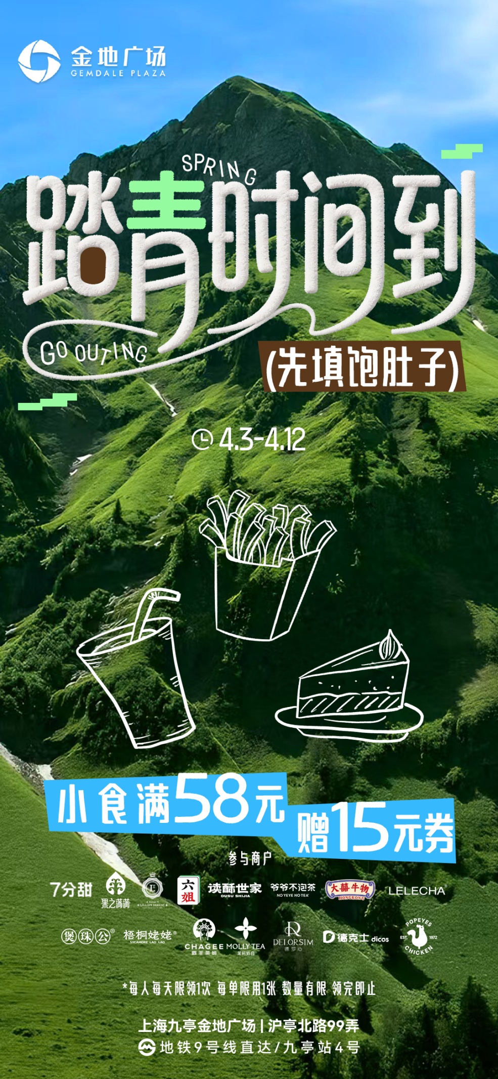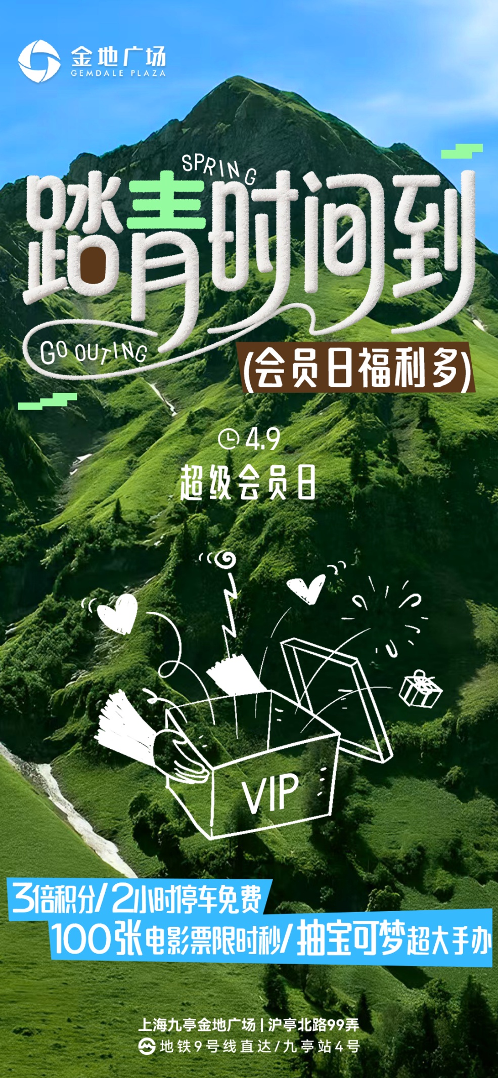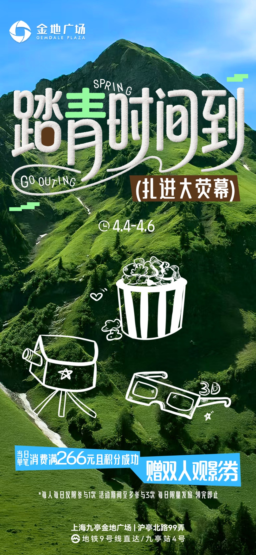 假期三天(4.4-4.6),消费满266元,直接送双人电影票!逛街看片两不误,约会日程一键搞定。