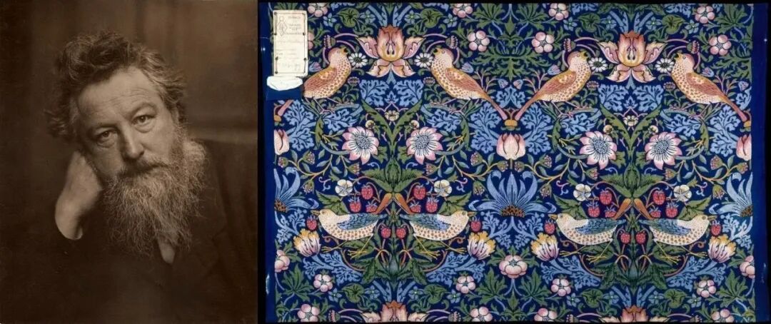 左图为工艺美术运动领袖威廉· 莫里斯,右图为他设计的“草莓小偷”家居纺织品(图源自世博会博物馆公众号)