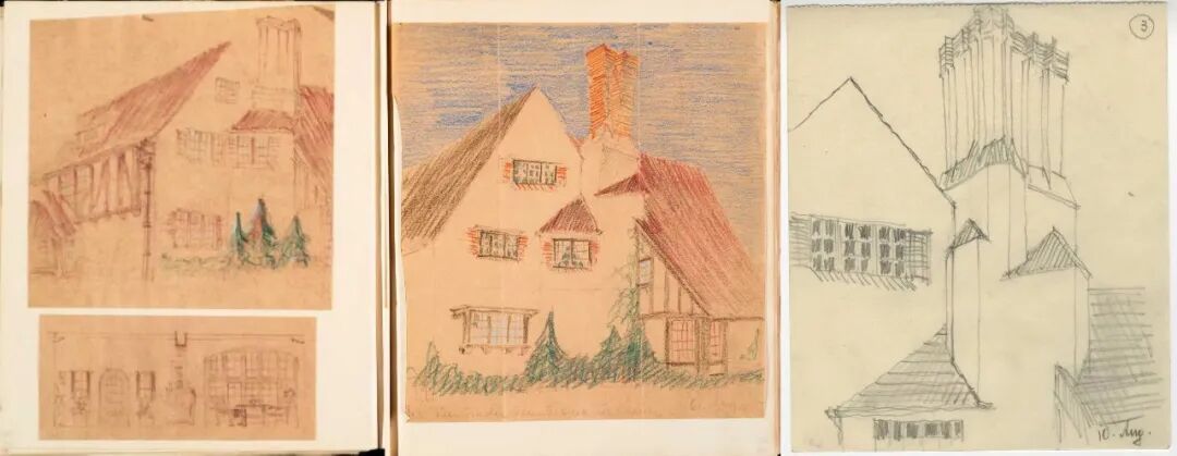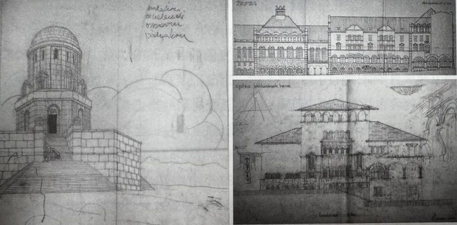邬达克大学时期的设计作品:战场上的小教堂(左);毕业设计,上匈牙利的舞厅和旅馆设计(右上);建筑师住宅(右下)(图、文源自《邬达克》)