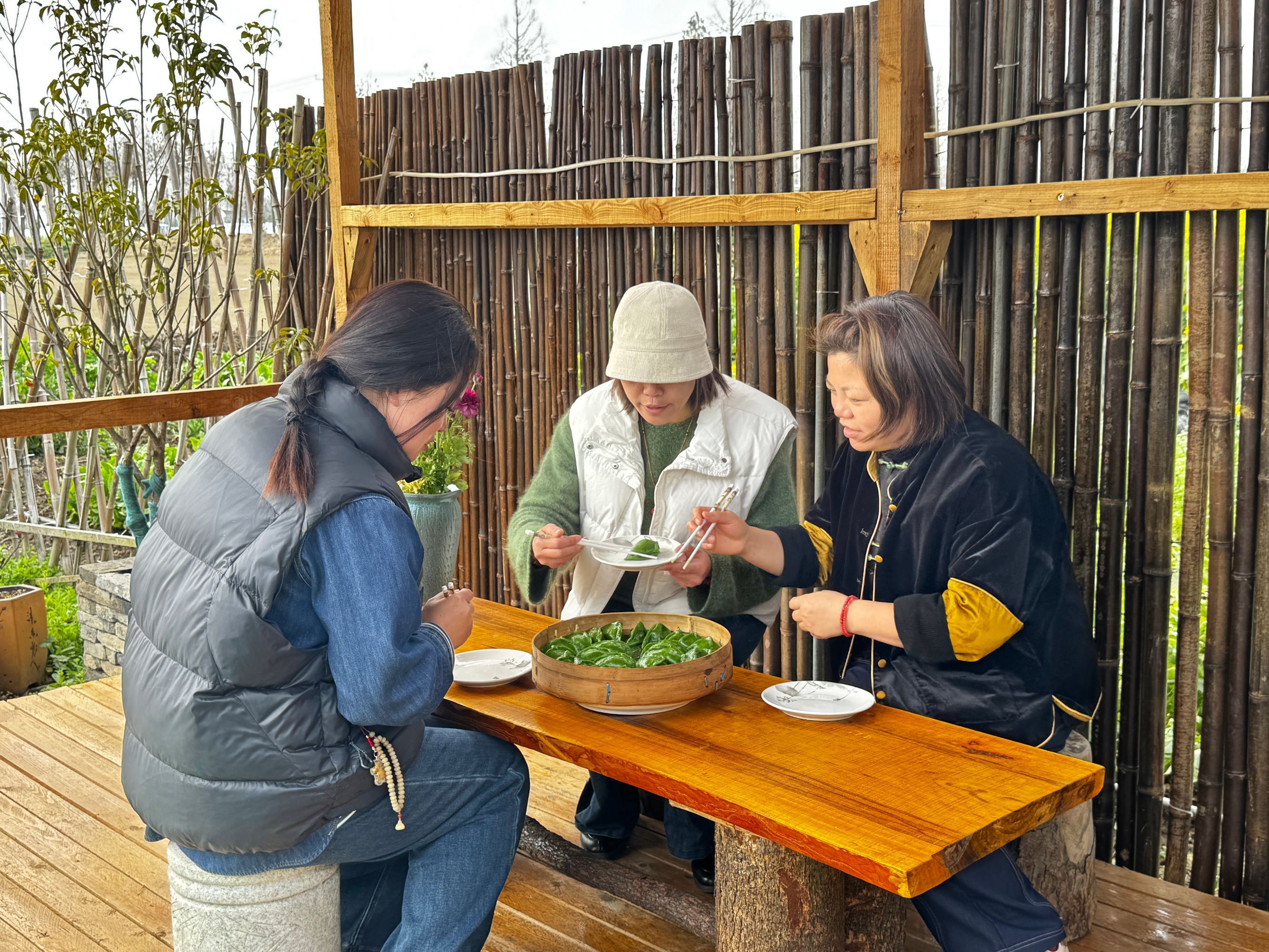 周红梅将包好的青龙饺整齐码入竹蒸笼,农家灶膛内柴火烧得正旺。盖上笼盖,约10分钟后,蒸好的青龙饺色泽鲜亮,外皮碧绿如玉,内里馅料饱满。新出锅的青龙饺被送往食客手中,一口下去,传统豆沙馅甜糯绵密,马兰头笋丁馅新鲜可口。食客朱春梅连连称赞:“满满的都是春天的味道!外皮软糯清香,咬开后,清爽的马兰头与咸鲜的咸肉、脆嫩的笋丁相互融合,鲜而不腻,口感特别丰富。”