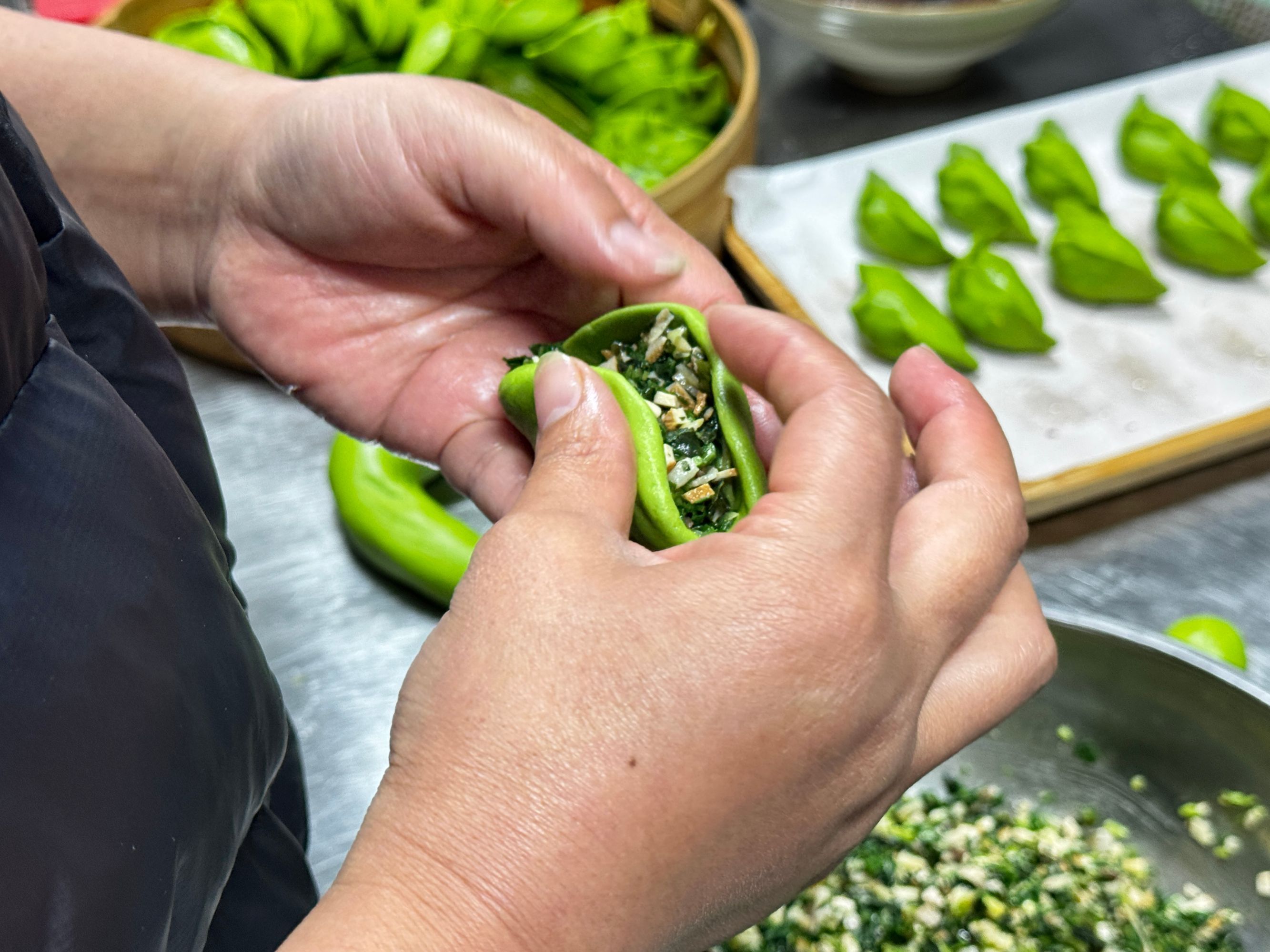 据了解,在松江浦南地区,清明节食用青龙饺的习俗由来已久。与青团不同,青龙饺形似元宝,外皮以麦草汁染就碧绿色泽,古时常盘成龙状用于祭祀,既是对先人的缅怀,也寄托着对一年风调雨顺、五谷丰登的祈愿。