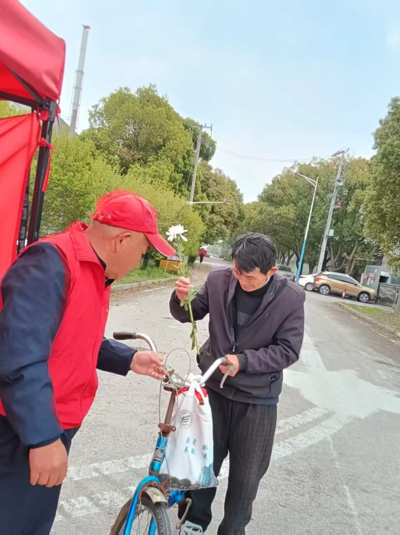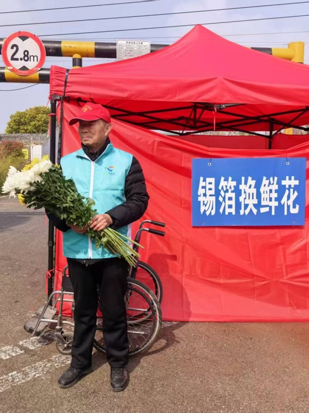 入口处,他们是便民服务的“贴心人”。“可以用纸钱换一束鲜花。”结合“无烟祭扫”相关要求,志愿者们在入口设立兑换点,引导市民以鲜花替代锡箔纸钱。服务点还贴心准备了轮椅租借,为行动不便的市民提供便利。
