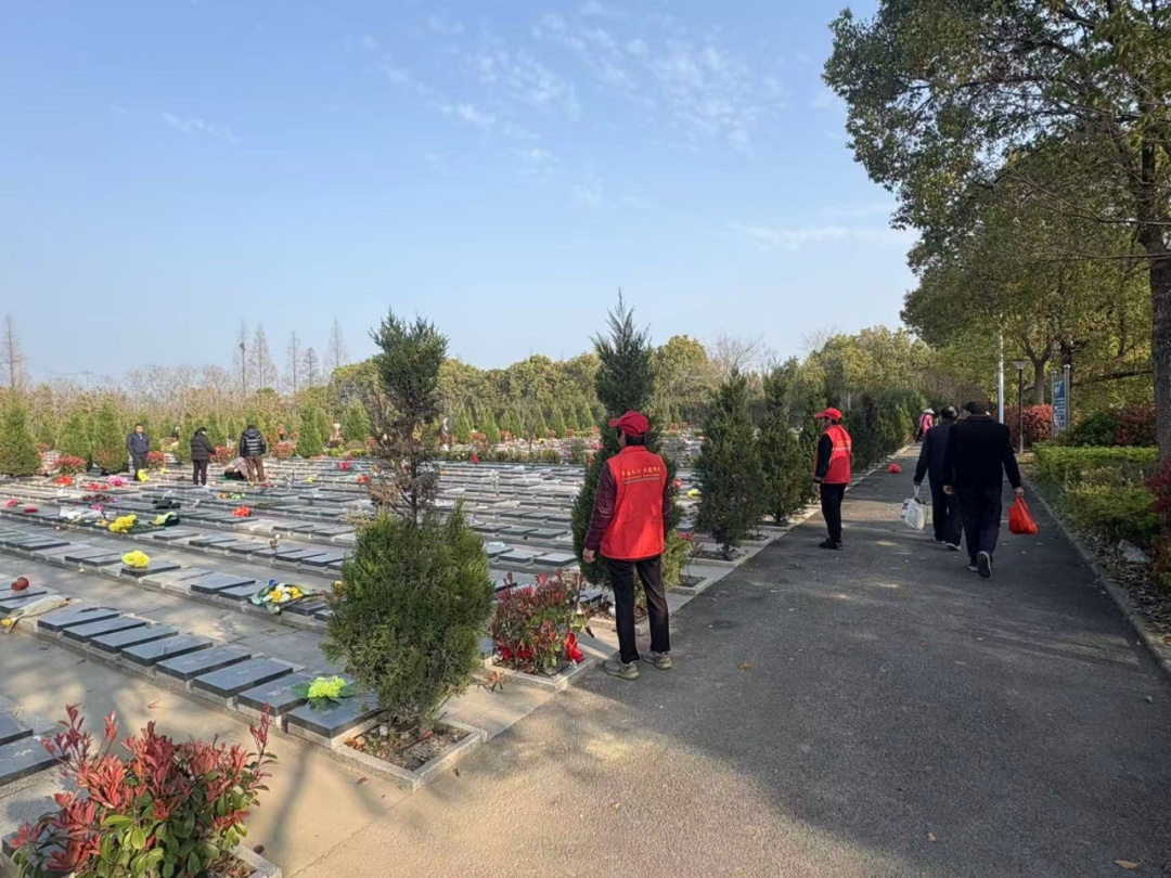 墓区里,他们是文明的“守护者”。在墓区各处,志愿者们穿梭巡查,提醒市民保持安静、遵守秩序。遇到携带锡箔的市民,他们耐心引导、解释政策。一句句温馨提示,一次次善意劝导,守护着这片肃穆之地的庄重与安宁。