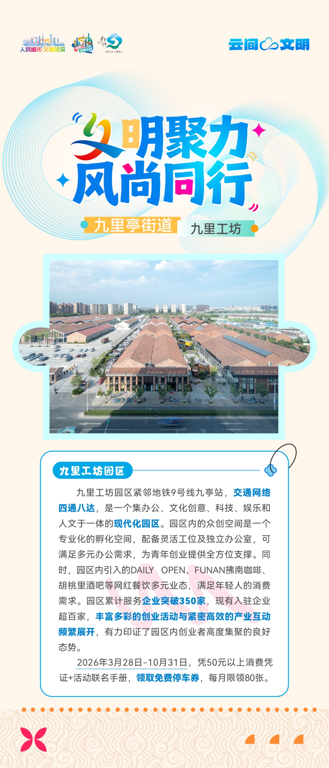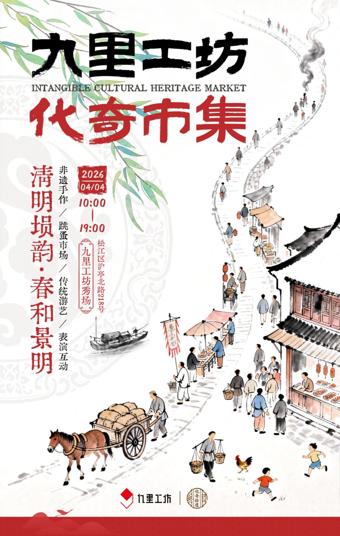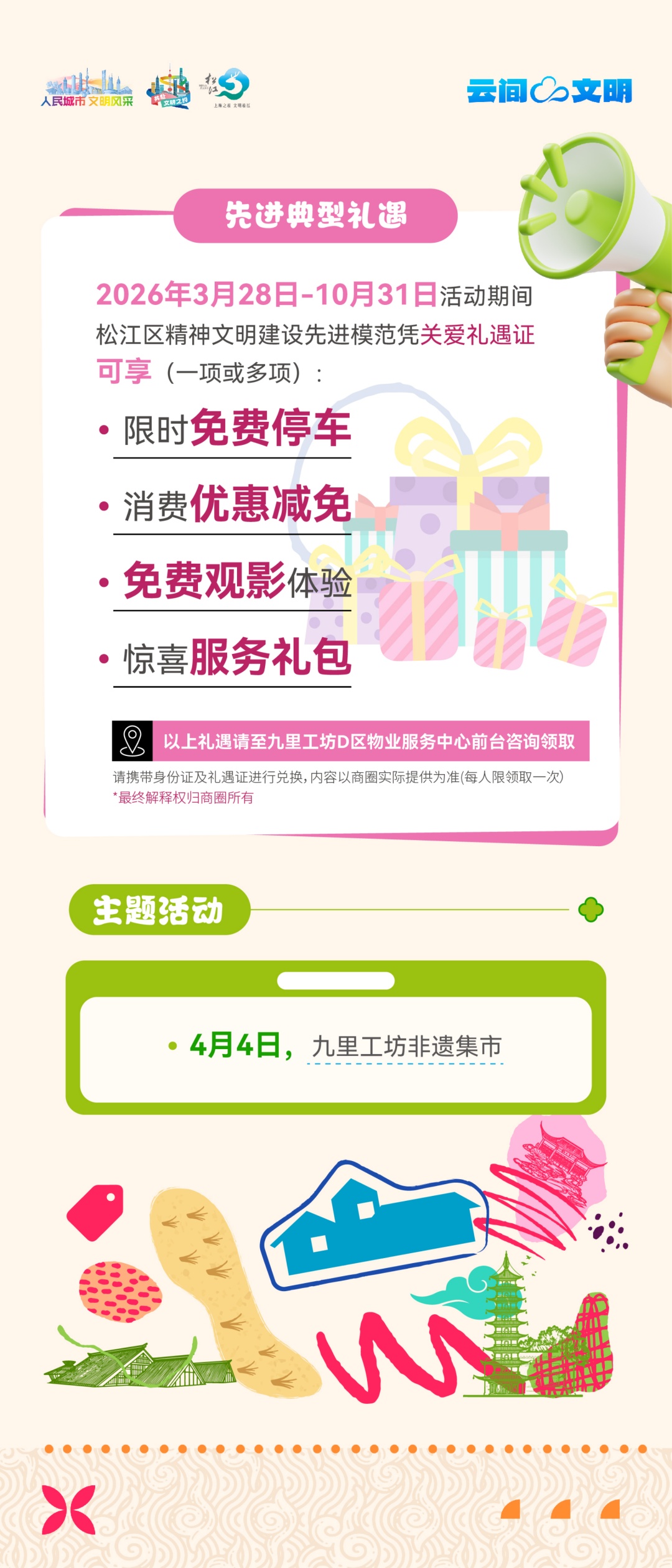 4月4日(本周六)10:00-19:00,九里工坊·化奇市集热力开市,邀你共赴松江区文明风尚季,边逛边玩边解锁专属好礼!