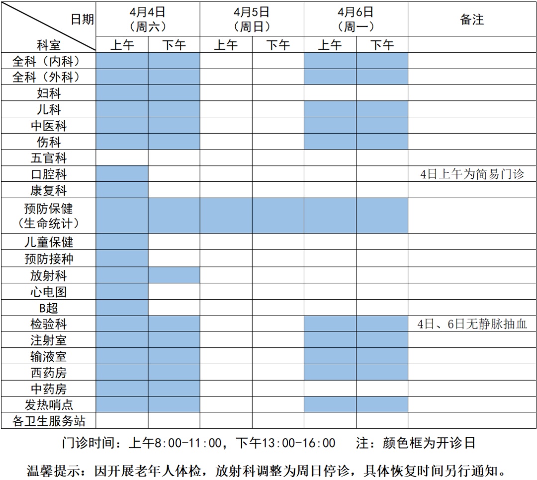 各卫生站4月4日~6日节假日期间停诊,4月7日正常上班。