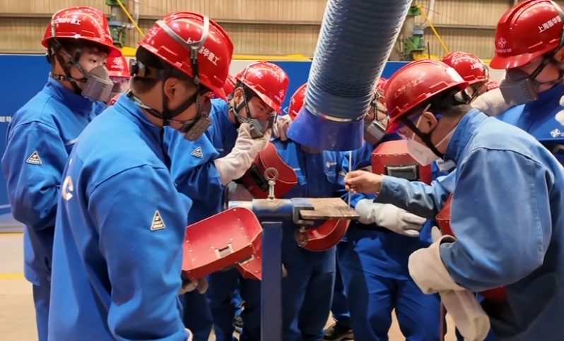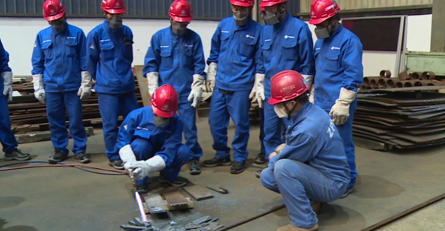 振华重工长兴分公司核心技能人才培训中心副主任巍钧介绍:“我们设置了火焰切割、手工电弧焊、气体保护焊等培训项目,根据结构构件的焊接位置进行专业指导。待学生技术熟练后,再安排进入车间。一般实训周期为1到3个月。