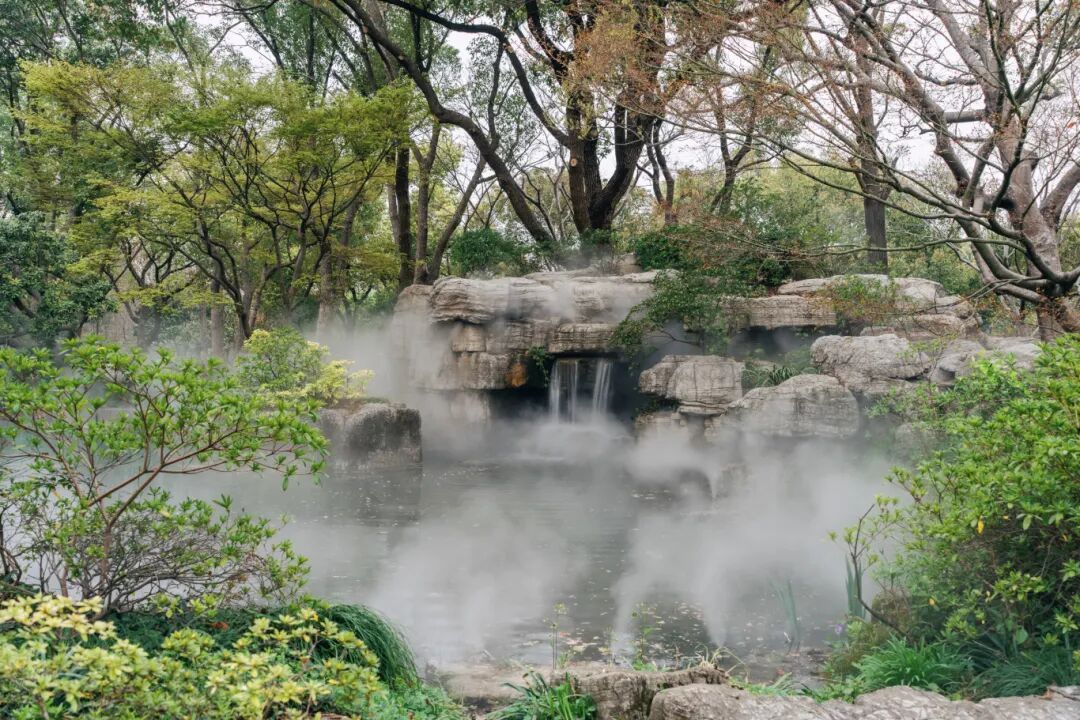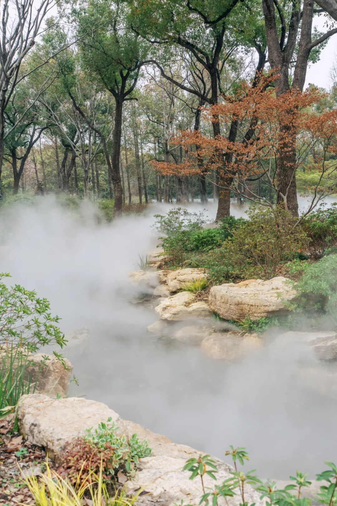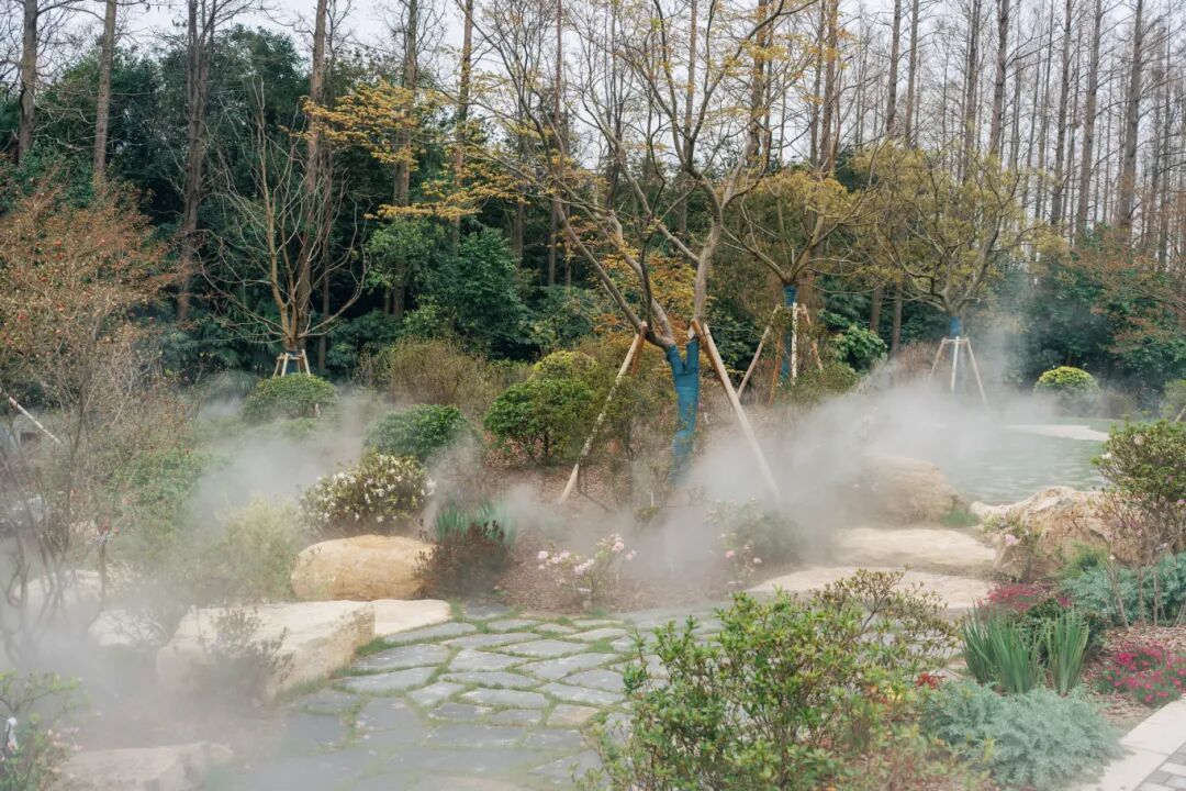园区引入水肥一体化智能系统,并增设雾森、叠溪溪流等动态水景,形成动静相宜的水态风光。