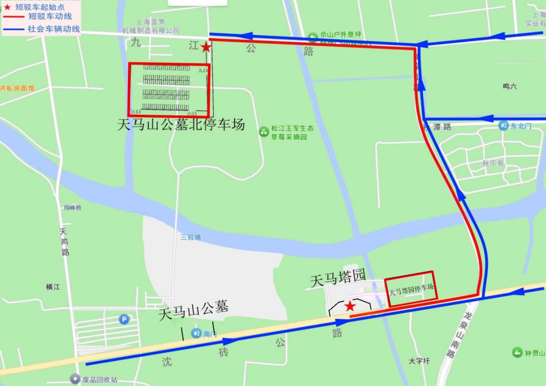 出行提示:祭扫高峰日(4月4、5、6日)前往天马塔园祭扫市民,可将车辆停至临时停车场天马山公墓北停车场(地址:九江公路218号),7:00-15:30有短驳车接运,客满即开。