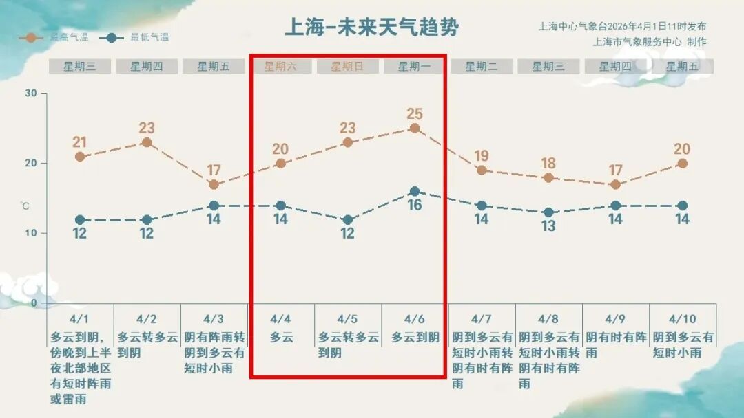 4月4日至6日清明假期期间,预计以多云天气为主,温度在12℃~25℃左右,春季晴雨切换频繁,请广大市民祭扫出行前及时关注最新的预报信息,合理安排出行。