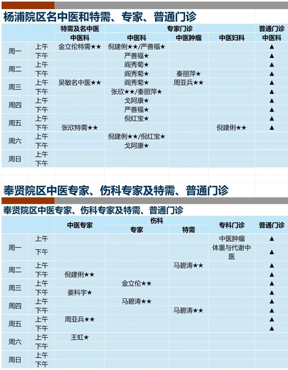 杨浦院区和奉贤院区均常年开设中医肿瘤专家坐诊,具体如下: