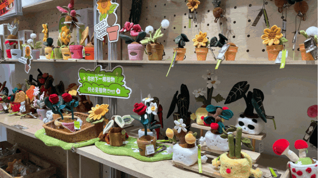 走进“上植印象”旗舰店,仿佛步入一座微缩的植物美学馆。空间设计以“绿意生长”为灵感,大量运用原木、绿植与自然光影,营造出通透、灵动的沉浸式氛围。暖心治愈的毛绒植物、声音舒缓解压的果壳摇铃、带着草木气息与自然印记的手工制作产品,各种取材真实植物的创意好物,将植物的生命之美、艺术之韵、科学之趣一一呈现,共同构成一座品类丰富、层次多元的“植物文创博物馆”。