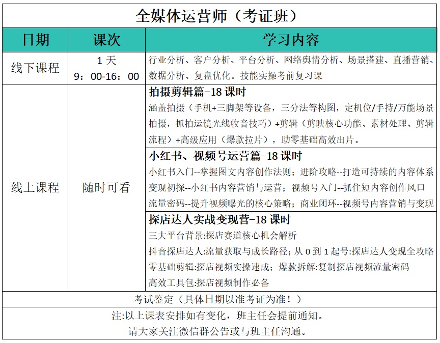 现在,它终于来了!国家认证高级工证书、全流程实战教学、零基础也能轻松上手,从短视频创作到直播运营,从账号搭建到流量变现,一站式教你玩转全媒体!二期名额有限,想抓住数字风口、提升职场竞争力、解锁副业新技能的朋友,千万别再错过!