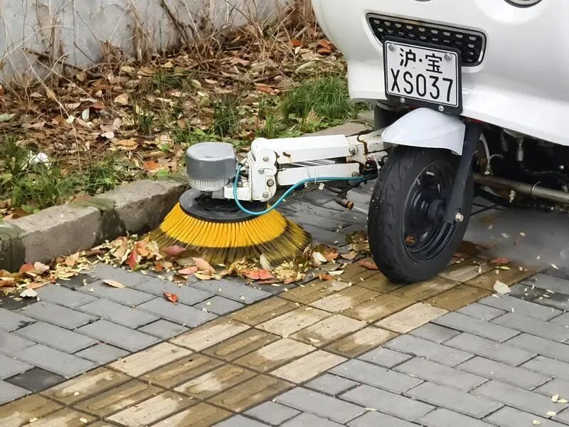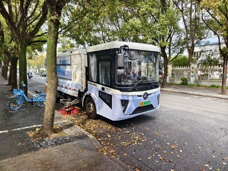上午,相对僻静的宝林路上人车比较稀少,这对于保洁作业是有利的。来自城运集团宝山环境公司的一个班组开始对这里的落叶进行清扫。他们先开着一辆小型清扫机对人行道进行保洁,清扫机的水平旋转轮刷沿着绿化带上街沿把人行道上的落叶扫向内侧,安装在同样位置的喷水头则喷洒出细细的水流,将这些落叶冲下人行道,落在非机动车道上。这时候,“大块头”的扫路机出动了,它一路缓缓开行,将道路上的落叶、零碎垃圾打扫得干干净净。