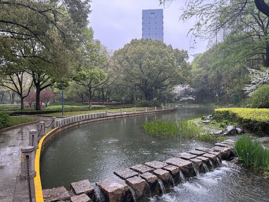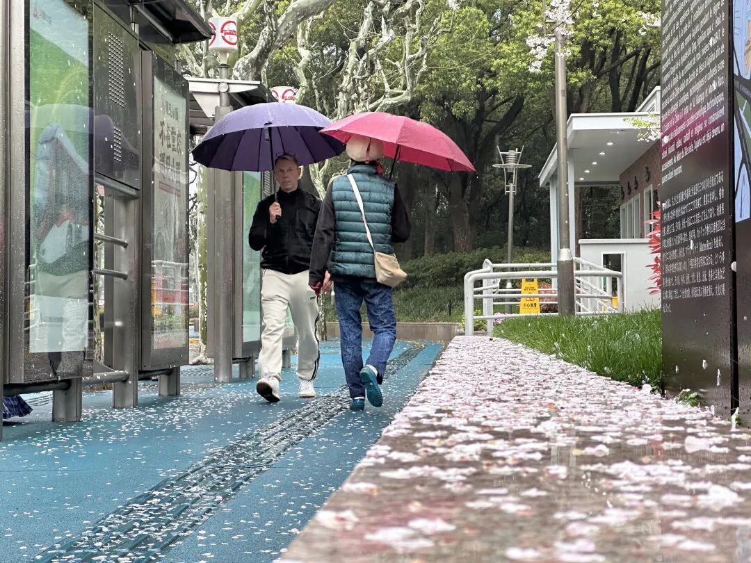 上午十点,记者在徐家汇公园外的街头步道上看到,粉白花瓣随雨飘落,铺满湿漉漉的路面,行人撑着各色雨伞缓步前行,伞影与花影交织,构成一幅诗意的雨巷画卷。