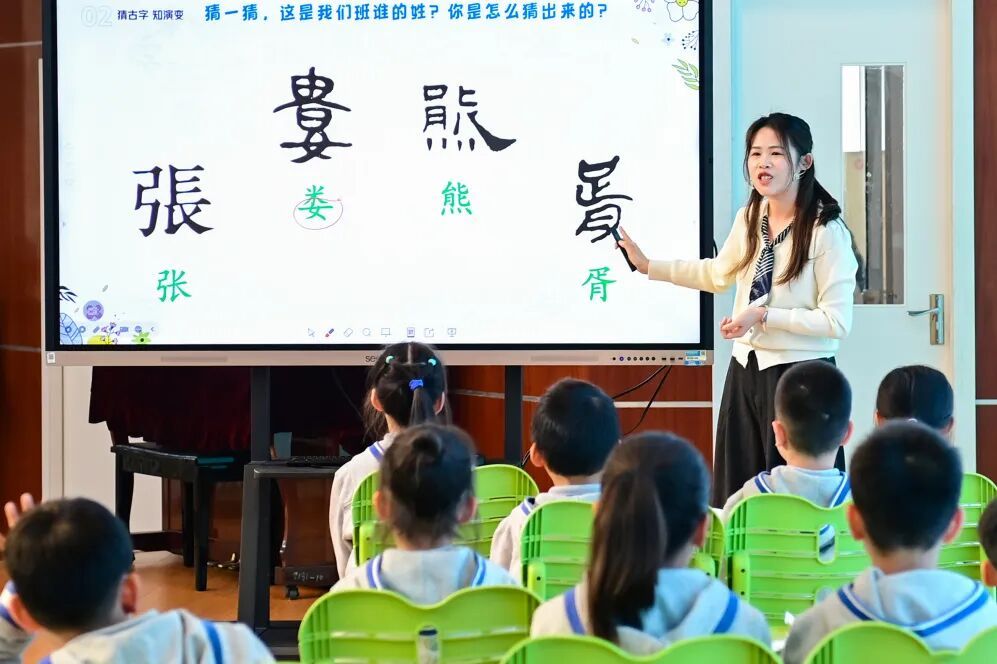 丁湘依老师执教一年级《我的姓氏真奇妙》一课。课堂以《姓氏歌》导入,通过趣味连线游戏,引导学生在简体姓氏与古文字之间建立联系,初步感知汉字的演变历程。整堂课将识字教学与家国情怀巧妙融合,展现了低年级汉字文化教育的生动样态。