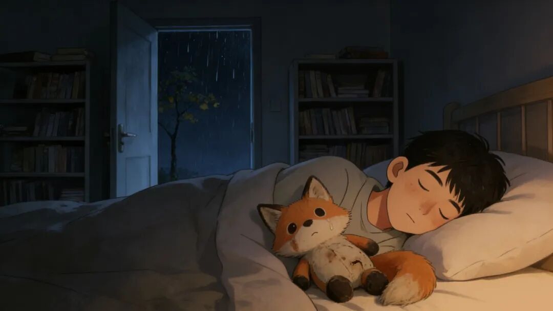 我睁开眼,看着眼前黑黢黢的房间与天花板,灰色的书架,想起空荡荡的父亲曾经的房间,房门外那棵现在还很小的梧桐树,还有黑夜中冷漠的细雨飘零。我看着床上我身旁破旧的狐狸玩偶——我父亲买给我的,上面还有刚干的泪渍,一股不知从哪里而来的勇气包围了我,我闭上眼。